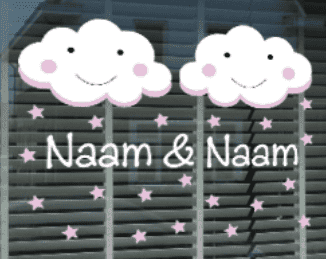 Met deze mooie geboortesticker laat je op een leuke manier zien dat er een meisjes tweeling geboren is. Op de geboortesticker staat twee wolkjes afgebeeld. Uit de wolk vallen roze sterretjes met daartussen de namen van de twee pasgeboren meiden.