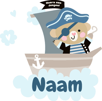 Met deze stoere geboortesticker laat je op een leuke manier zien dat er een jongen geboren is. Op de geboortesticker staat een piraat beer op een boot met daarbij de naam van het pasgeboren meisje. Op het vlaggetje van het boortje stat de tekst: Hoera een Jongen!