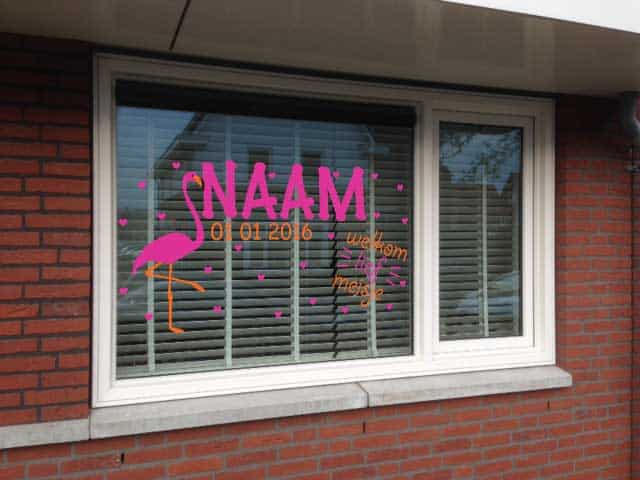 Een geboortesticker volledig in kleur op het raam is de nieuwste trend. Met deze mooie en unieke geboortesticker laat je op een leuke manier zien dat er een meisje geboren is. Op de geboortesticker staat een Flamingo omgeven dor kleine hartjes afgebeeld met daarbij de naam en de geboortedatum van het pasgeboren meisje.